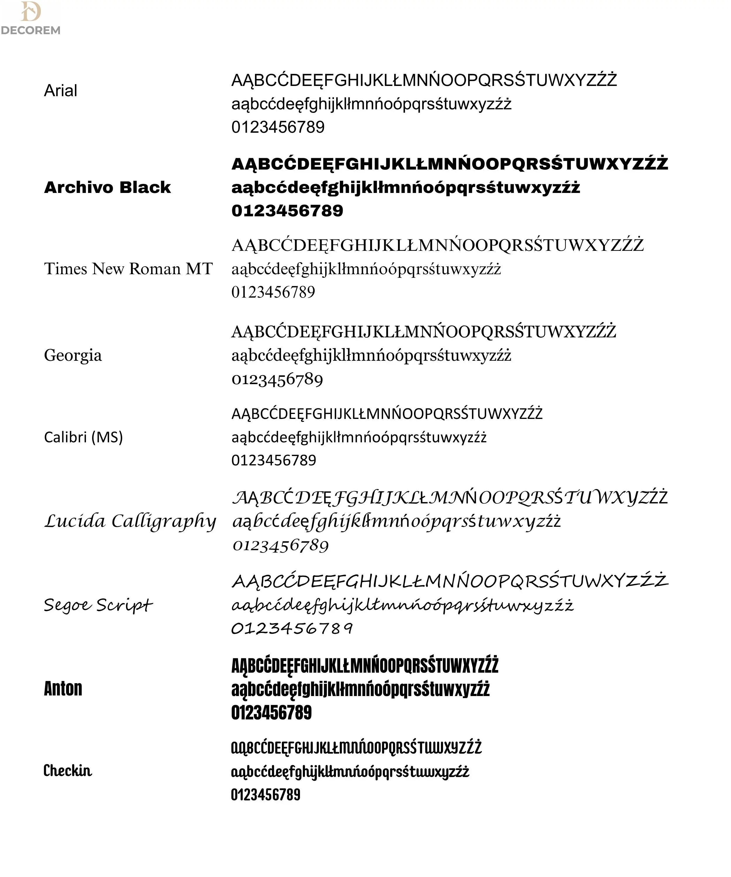 - treść napisu lub rodzaje liter/cyfr, wraz z ilościami